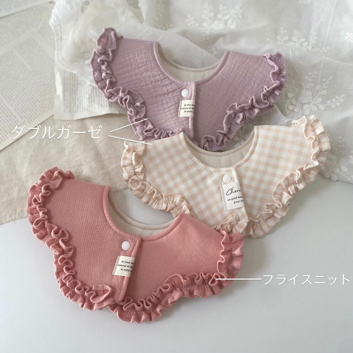 ▶︎frillはなびらスタイ ダブルガーゼ ( pink beige / dull pink) おまとめ2set 3450yen
